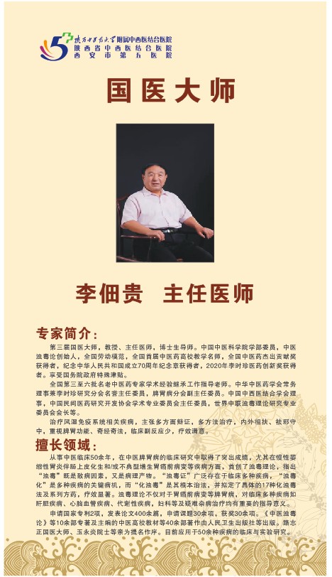 李佃贵先生是第三届国医大师,曾获得全国劳动模范、全国中医药杰出贡献奖获得者等多项荣誉称号。从事中医临床工作50余年,尤其擅长脾胃病的治疗,首创“中医浊毒理论”,指导治疗多种疑难杂症,疗效显著。在治学育人方面,李教授医德医技并重,培养了一批又一批中医药人才。