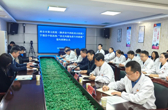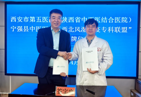 为深化医疗协作,推动优质医疗资源下沉,2026年4月9日上午,西安市第五医院(陕西省中西医结合医院)与宁强县中医医院“西北风湿免疫专科联盟”签约授牌暨大型义诊活动在宁强县中医医院隆重举行。此次活动由我院牵头,旨在将高水平的风湿免疫诊疗服务送至基层群众身边。西安市第五医院(陕西省中西医结合医院)院长郭华带领多学科专家团队及医务科、院办一行11人前往宁强县中医院,双方通过座谈会等形式在学科建设、医院管理等方面进行深入交流。