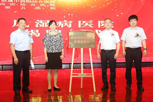 西安交通大学第一附属医院风湿免疫科主任何岚教授,西安市第五医院院长、党委副书记冯占伟,党委副书记、副院长贾强与西安市第五医院风湿病医院院长黄小强共同进行了揭牌。