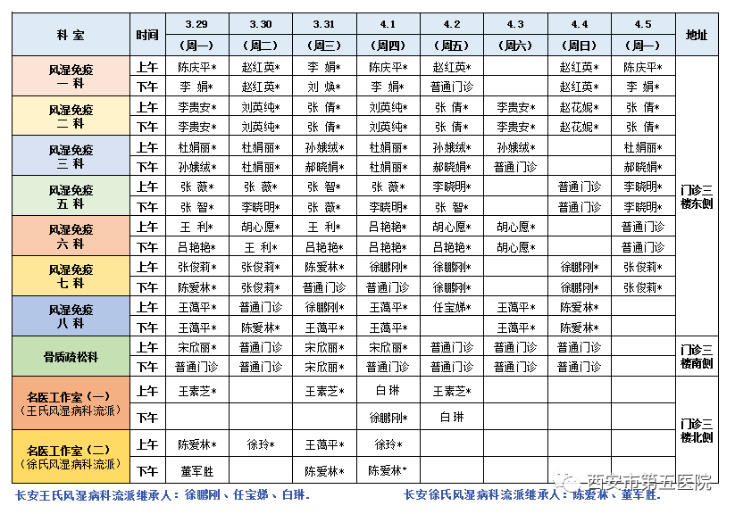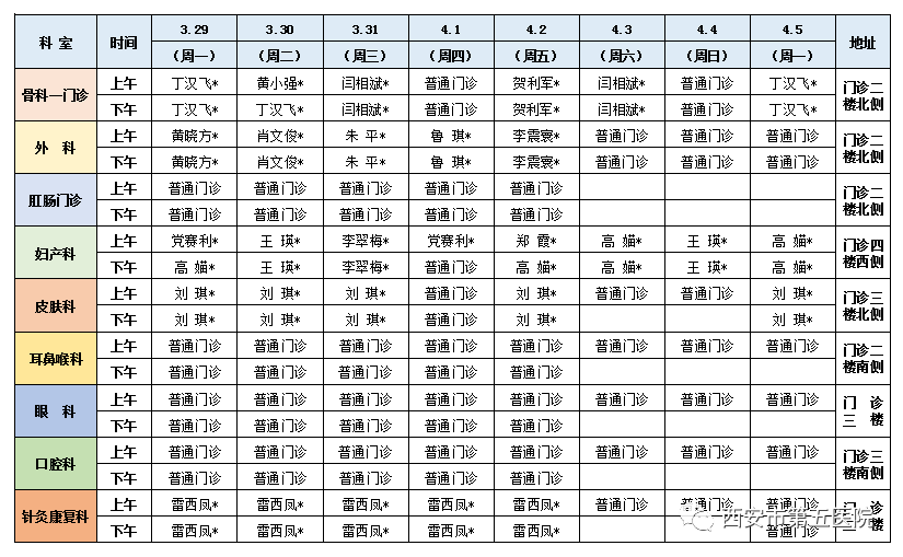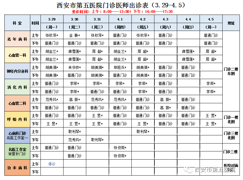 西安市第五医院门诊医师出诊表(3月29日-4月5日)