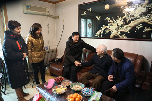 2月6日上午,市五院领导班子成员带领相关科室负责人,携带慰问信、慰问金、慰问品先后来到内科五病区,看望住院的离休老干部翁奎、黄敬之、陈文启,随后看望了在家属院居住的马长生、商凤楼等离休干部及退休职工卢凤云。李书记、张院长亲自将慰问信、慰问金送到老同志手上,赞扬他们是医院的宝贵财富,肯定他们在医院建设发展中做出的贡献。感谢他们仍然关心医疗卫生事业,为医院发展建言献策。希望他们继续发挥余热,老有所乐,老有所为。并祝福老同志们注意身体,健康长寿。
