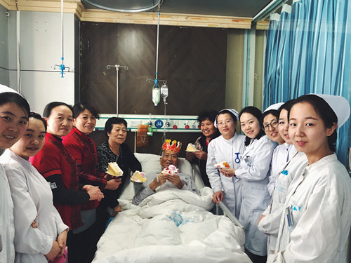 自古以来,好的医生,不仅能治身,亦能医心。所以我们计划着,在老人70大寿来临之际,用我们的爱,来温暖岁月带给老人的斑驳痕迹。没有五颜六色的气球,没有鲜艳娇媚的花朵,没有琳琅满目的家宴,也没有华丽整齐的衣裳……入目依然还是一片白,老人穿着旧衣,坐在病床上,甚至还挂着液体,他的面前只有一个大蛋糕,蛋糕上简单的几根蜡烛,将那一个大写的“寿”字突显的熠熠生辉。“祝你生日快乐,祝你生日快乐……”我的耳边是同事悦耳的生日祝福歌,她们轻拍着手掌,微笑应和着,我们彼此都知道,在这每一句“祝你生日快乐”的背后,都承载着我们对老人最大的祝福。