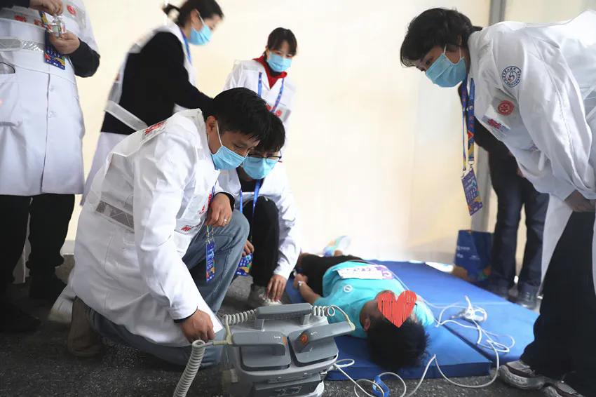 凌晨4时西安市第五医院(陕西省中西医结合医院)医疗保障人员在副院长黄小强带领下,满载着5箱急救物资和20余名医护人员的救护车驶向马拉松半程终点医疗保障点。凌晨5时到达保障点后大家坚守岗位,各司其职,默契配合,向急救中心总台报告位置,急救设备组逐一检查调试除颤仪、心电监护仪等设备,药品组逐一核对急救药品并分类摆放,医疗组分类整理摆放物品,观察员组针对赛事中容易发生问题的路段研究站位策略。