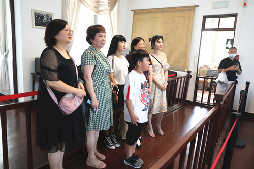 随后,党员们顶着炎炎烈日,自行乘车来到位于建国路69号的张学良公馆、西安事变纪念馆。张学良将军公馆建于1932年,北面是为东西排列的三座三层砖木结构西式楼房。西安事变发生后,周恩来率中共代表团来此与张学良、杨虎城共商救国大计。东楼是机要楼,中楼有客厅、会议室,西楼为张学良的居室。可以说这里见证了一段惊心动魄的故事,也是见证了张学良、杨虎城将军及一众爱国人士的一颗颗赤子之心。