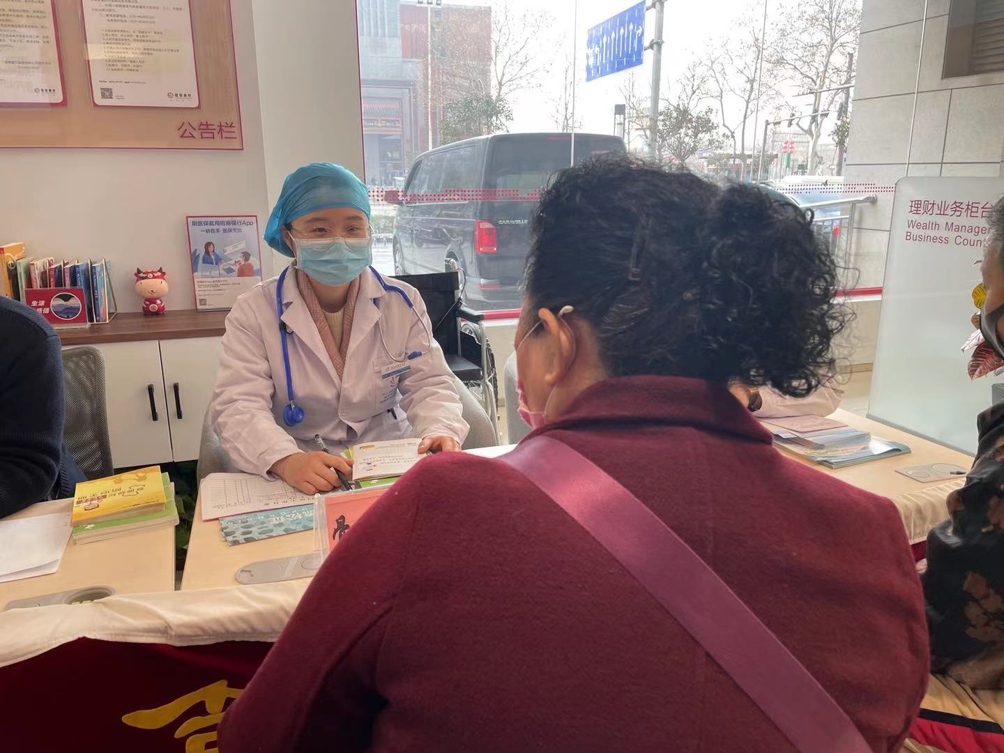 在腊月二十八这天,当大家都在忙碌的准备年货的时候,在五院宣传科的带领下,由老年病科主任张秋萍、骨质疏松科住院医师王妞、骨质疏松科护士高洁、风湿免疫科二病区护士郑丽芳组成的义诊团队,来到了朝阳门外招商银行的大厅,为前来办理业务的老百姓开展义诊活动。