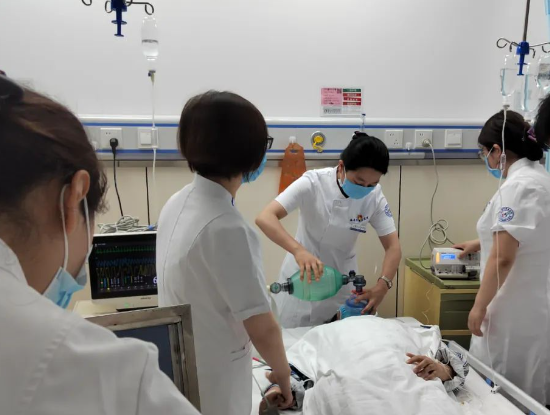 为检验医护团队应急反应能力,护士长刘华随机出题:“现在患者出现严重喉头水肿,血压60/40mmHg,血氧饱和度70%......”,听到指令,医护团队迅速反应,立即展开抢救,简易呼吸器辅助呼吸,静脉给药扩容,立即给药,通知外科,必要时行气管切开,呼吸机辅助呼吸,处置及时有效,生命体征平稳后,主任和护士长给病人及家属做好解释、安抚工作。