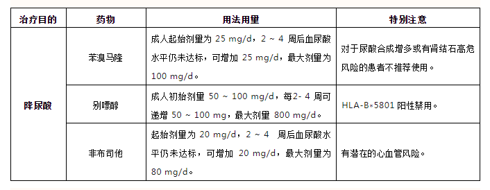 长期降尿酸治疗是根治痛风的关键,含抑制尿酸生成(别嘌醇和非布司他)及促进尿酸排泄(苯溴马隆)两类药物。