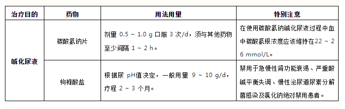 碱化尿液是预防和溶解尿酸性肾结石的主要方法,常用药物有碳酸氢钠和枸橼酸制剂。