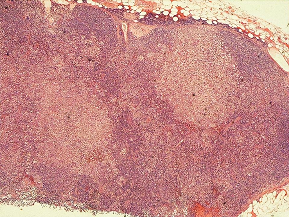 菊池病的淋巴结活检(淋巴结活检病理学提示淋巴结炎,表现为斑片状皮质旁和皮质坏死,伴有丰富的核碎屑。坏死灶周围有广泛的组织细胞浸润,有不同程度的免疫母细胞和淋巴细胞。主要的淋巴细胞是CD8+T细胞)