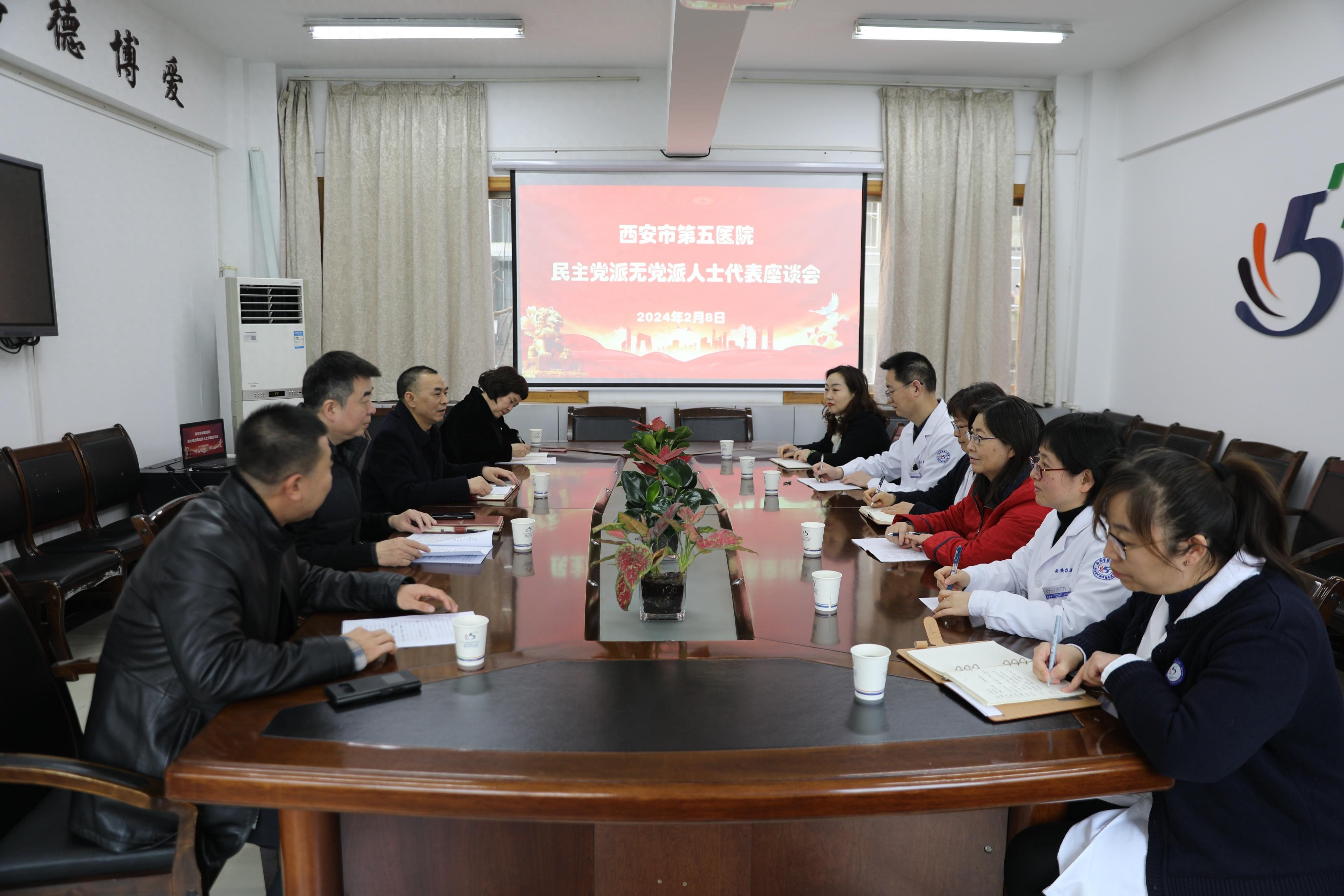 2月8日上午,西安市第五医院(陕西省中西医结合医院)党委召开医院各民主党派、无党派人士代表座谈会,共庆甲辰龙年新春,共商医院发展蓝图。刘武柱书记、郭华院长参加座谈会,会议由党办主任杜磊主持。