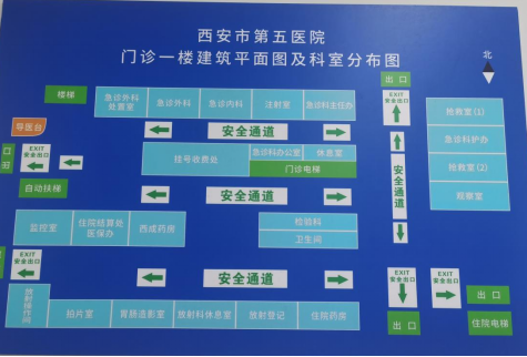 门诊1-4楼各楼层均有突发事件的应急疏散和安全通道路线、指引标牌、路线。