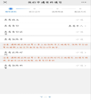 5.填写申请资料,患者姓名、患者身份证号、患者住院号、患者出院时间、患者住院科室----点击下一步