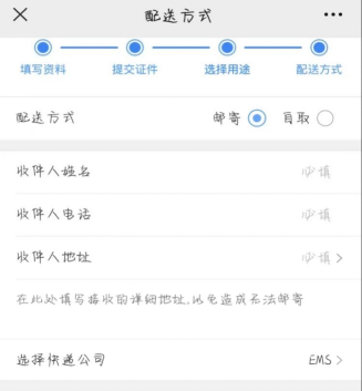 8.点击下一步,选择取件方式(自取/邮寄),填写收件人姓名、收件人电话、收件人地址