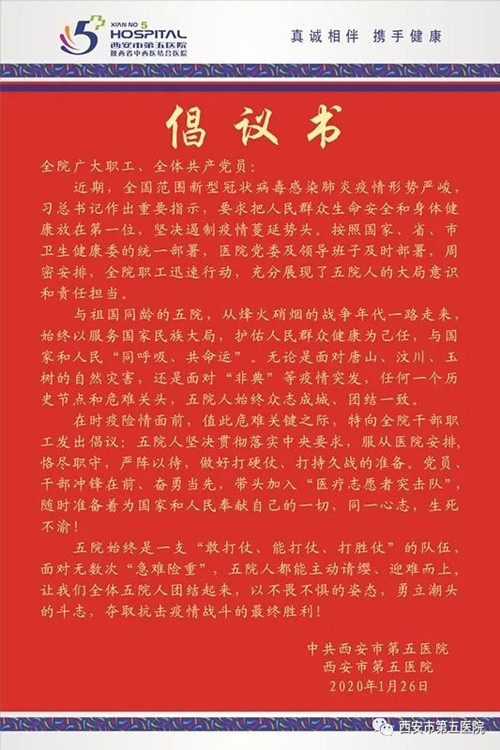 市五院向职工发出倡议书 全院职工积极响应请战