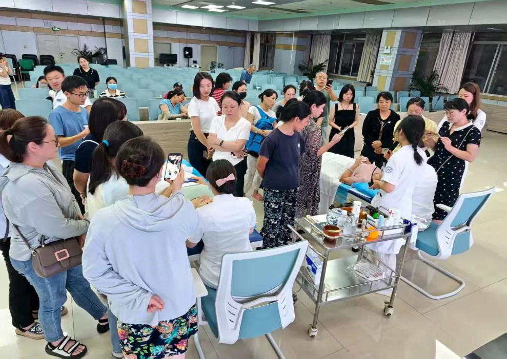 在体验环节,我们现场抽取了4名学员,亲身体验了由主管护师郝红伟、秦瑜融合传统中医特色的中式“热拉提”综合护理,内容包含面部穴位按摩、特色火龙罐以及中药面膜贴敷。在现场,由皮肤科马璐瑶医师全程为大家详细讲解面部穴位按摩的原理与功效、火龙罐的温热疏通经络作用以及中药面膜的独特养肤益处,并解答学员们提出的各类疑问。由郭儒医师详细讲解了面部穴位的取穴及按摩手法,通过面部穴位按摩,能改善气血循环、加速代谢废物,实现紧致轮廓、淡化细纹、提亮肤色的功效。现场互动积极,气氛热烈,学员们对中医美容的独特魅力有了更深入的了解和体会。