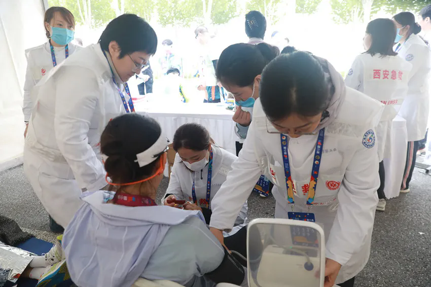 9时10分许,运动员陆续抵达半程终点,保障队员仔细观察运动员们的步态、面色、精神状态,发现异常的及时上前询问并进行检查。针对肌肉拉伤、关节损伤等突发状况,医疗团队迅速反应,及时予以妥善的处置和情绪安抚。一名成年运动员在冲过半程终点后出现心慌、面色苍白、大量出虚汗的症状,急救队员迅速将其扶出赛道,在救治区进行生命体征监测并立即给予吸氧、保温、补液等处理。截至11时30分,在保障现场处置运动员、志愿者、安保等工作人员共计565人次,其中各类扭伤、疼痛以及拉伤等给予喷雾、冰敷等处理485人次,处理皮肤擦伤近30人次,保温、补液、测血压血糖等服务50余人次。
