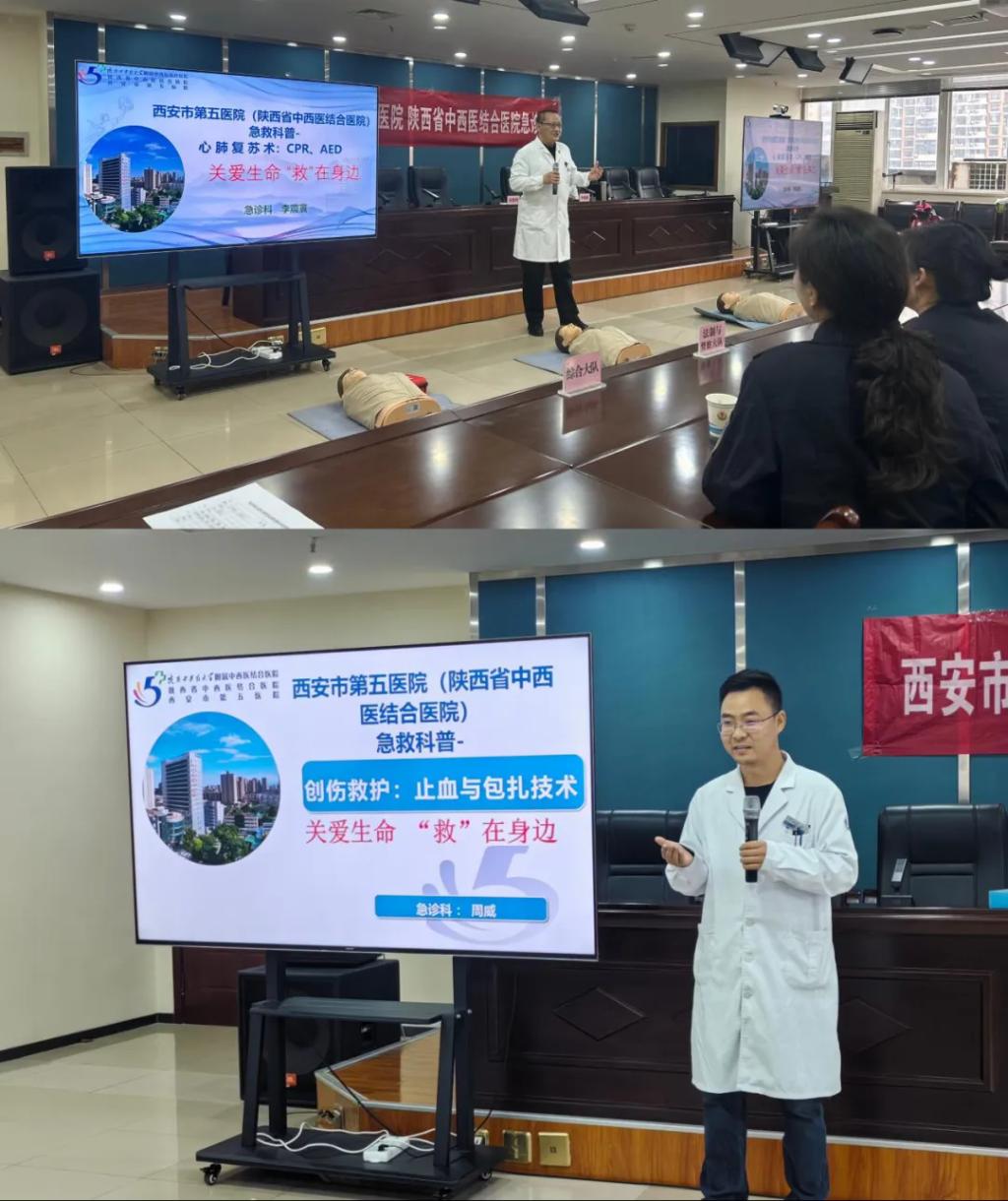 本次培训旨在将专业的急救知识从医院带到机关,让“黄金救援4分钟”的理念深入人心。培训现场,西安市第五医院的医护专家们通过“理论讲解+实操演练”相结合的方式,系统地讲授了心肺复苏(CPR)、海姆立克急救法、自动体外除颤器(AED)的使用以及常见意外伤害的简单包扎等核心急救技能。