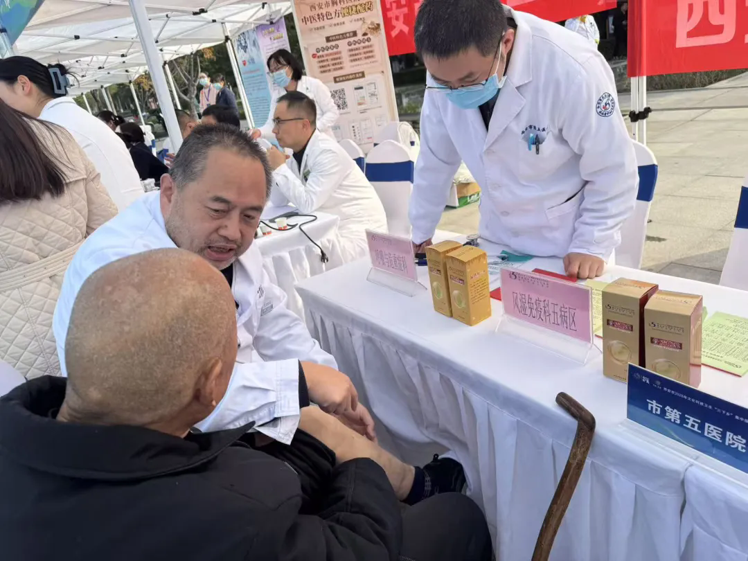 10月28日上午,阳光倾洒,暖意满溢,高陵区鹿苑街道昭慧广场人头攒动,热闹非凡。西安市第五医院(陕西省中西医结合医院)积极响应深入开展2025年文化科技卫生“三下乡”活动的号召,在市委宣传部、市卫生健康委的统筹组织下,由西安市第五医院纪委书记周圣千带队,带领风湿免疫科、皮肤科、呼吸与危重症科、骨质疏松科等专家团队,奔赴高陵区开展“三下乡”集中义诊活动,为当地群众送上便捷、专业的医疗服务。