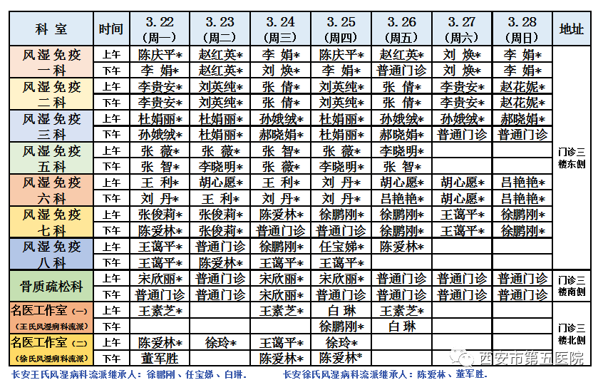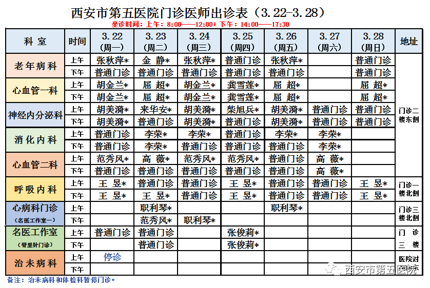 西安市第五医院门诊医师出诊表(3月22日-3月28日)