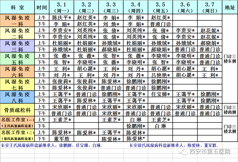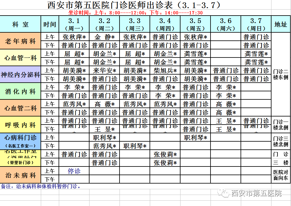 西安市第五医院门诊医师出诊表(3月1日-7日)