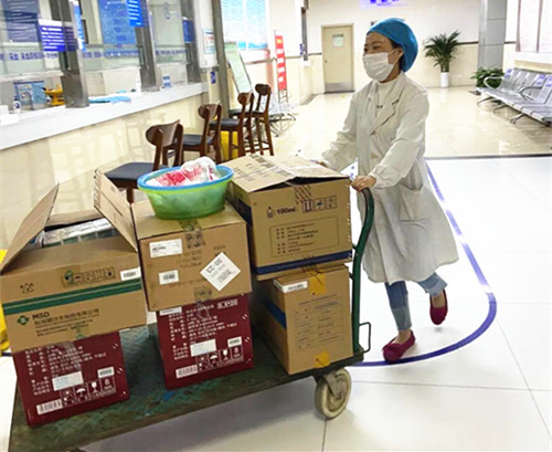 药剂科在便民门诊配备中、西药药师,高菂、王新晓、郭银萍、黄艳丽等几名女药剂人员每天坚持在小小的帐篷中为患者服务。除过白天正常发药工作以外,每天5:30下班后,几个人还要整理、清点当天药品,并用推车运回药房,在门诊药房加班。首先盘点当日发出药品是否与账务相符,根据当天患者用药情况进行药品品种和数量的调整,准备好第二天所需药品。将数十箱药品提前搬到转运车上,由于都是女同志,几十斤的自制品、大药箱需要几人合力装车,这时候娇弱的她们秒变女汉子,常常加完班已是晚上九点多,踏着夜色回家已成家常便饭。第二天早上7点到达科室,由王吉利主任带队,4名女同志在药房其他人员的帮助下,把药品转运车推至便民药房,进行药品清点、摆放,保证患者取用药物。