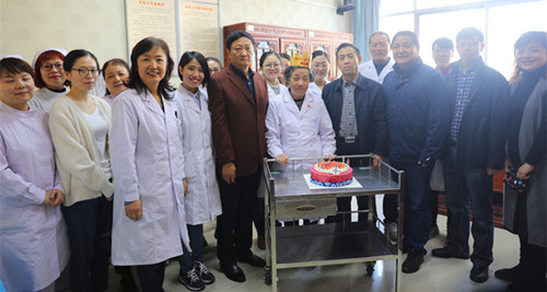 王素芝同志是全国名老中医之一,她在从事医疗卫生工作的几十年中,兢兢业业、任劳任怨,培养出了一大批优秀的临床医疗工作者。今年80岁的名老中医王素芝仍坚持工作在医疗岗位上,在科室病房里她传帮带年轻医生,在名老中医工作室里她坐诊为患者解除病痛,她将自己的满腔热情和全部精力奉献给钟爱的医疗卫生事业。在生日祝福的歌声中,院领导将点着生日蜡烛的蛋糕送到王素芝同志的手中,祝她生日快乐、身体健康!感谢她为医院发展作出的贡献,感谢她退休后仍坚持工作,发挥余热。王老对院领导的关怀表示感动和高兴。