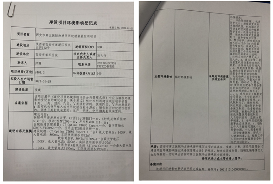 西安市第五医院《建设项目环境影响登记表》及放射工作场所检测报告公示