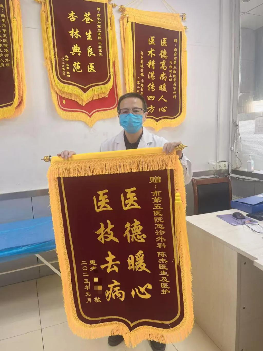 2025年新年伊始,西安市第五医院(陕西省中西医结合医院)急诊外科诊室又迎来了新的一天。一大早,一位老人带着感激之情来到诊室。他手持一面锦旗,用他那沙哑而又微弱的声音向正在忙碌着的陈医生打招呼:“陈医生,我来了,谢谢你……”,之后展开手中的锦旗,上面写着“医德暖心,医技去病”八个大字。